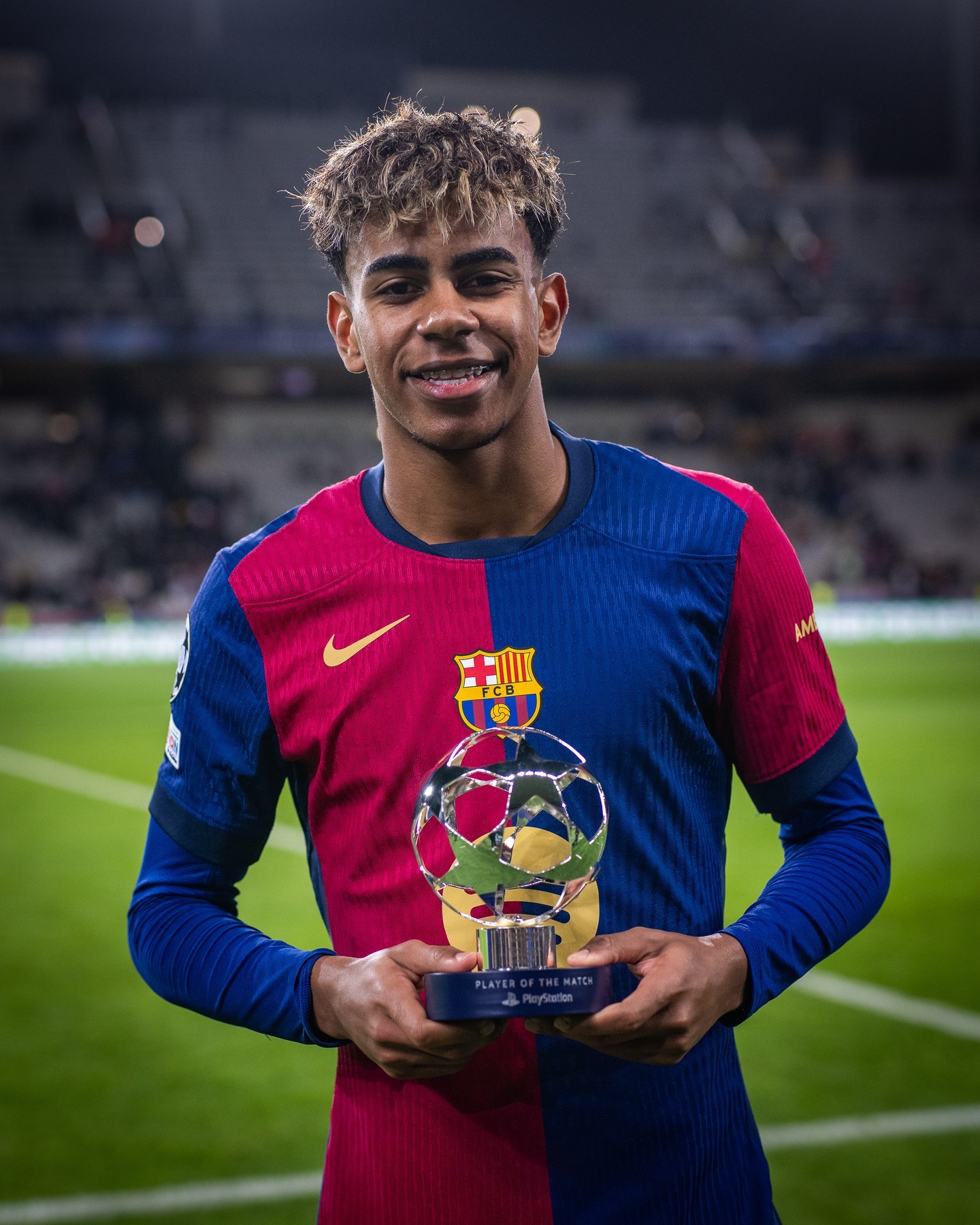 From an SEO perspective, the image strongly aligns with high-value search terms such as Lamine Yamal, Player of the Match, football stadium, young football prodigy, elite football performance, man of the match, professional footballer, European football, next-generation football talent, and future football superstar. The scene is ideal for content related to match reports, player analysis, football news, youth development in football, and individual awards in professional sports.